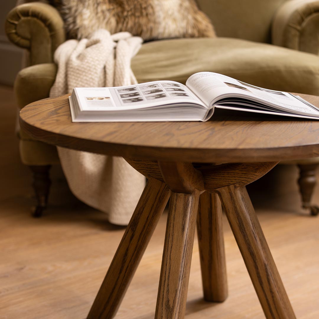 The Albion Coffee Table is a beautifully balanced piece that brings warmth, craftsmanship and understated elegance to the heart of your living space. Expertly crafted from solid oak, this round coffee table celebrates the natural character of the timber, with rich grain patterns and subtle tonal variations ensuring every piece is completely unique. Its softly rounded tabletop and sculptural angled legs create a distinctive silhouette that feels both contemporary and timeless.