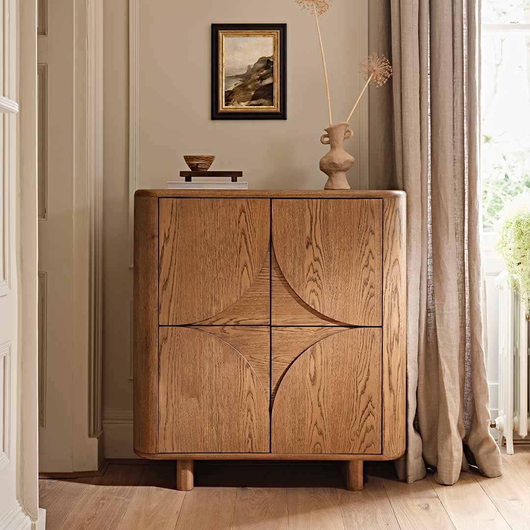 Its sculpted, curved edges and distinctive panel detailing create a sophisticated focal point, while the generous internal storage offers both practicality and style. Behind the doors, spacious shelving provides the perfect place to store tableware, glassware or household essentials, making the Albion Highboard ideal for dining rooms, living spaces or elegant hallways.